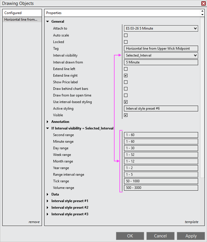 Example: Drawing on 60-minute chart makes it visible on 60-minute, 15-minute, 5-minute, etc., but hidden on daily charts.