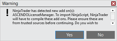 First prompt: Confirms that this NinjaScript assembly will run automatically when you start NinjaTrader.