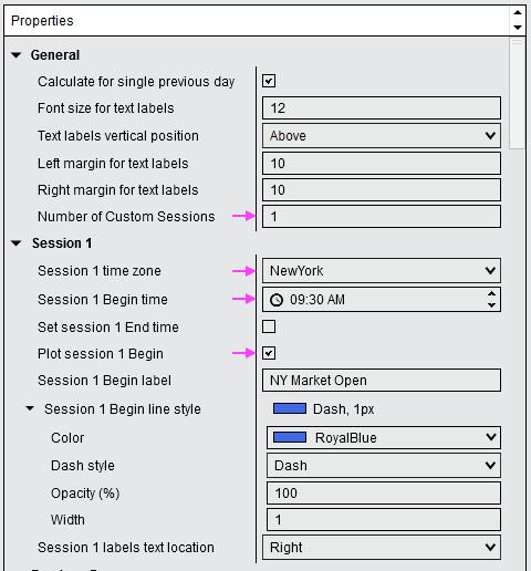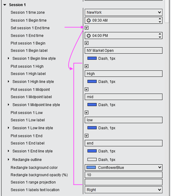 Example: Setting the Session 1 End label to “end” will display “end” on the chart. Using “End @P” will display the label with the actual price value.