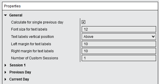 When you activate the Show Previous Day Levels parameter, the previous day’s values are displayed on the chart. Additional parameters become visible, enabling you to customize which levels to display and adjust the appearance of each level.