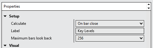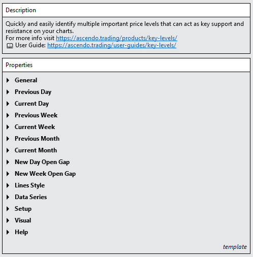The screenshot below shows all available parameters for the Key Levels indicator. Refer to the following sections for detailed explanations of each parameter.