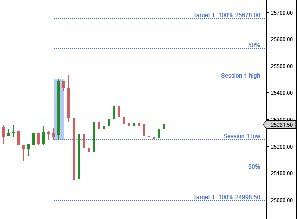Example: Setting the Previous Day Open label to “pd Open” will display “pd Open” on the chart. Using “pd Open @P” will display the label with the actual price value, such as “pd Open 25150.25”.