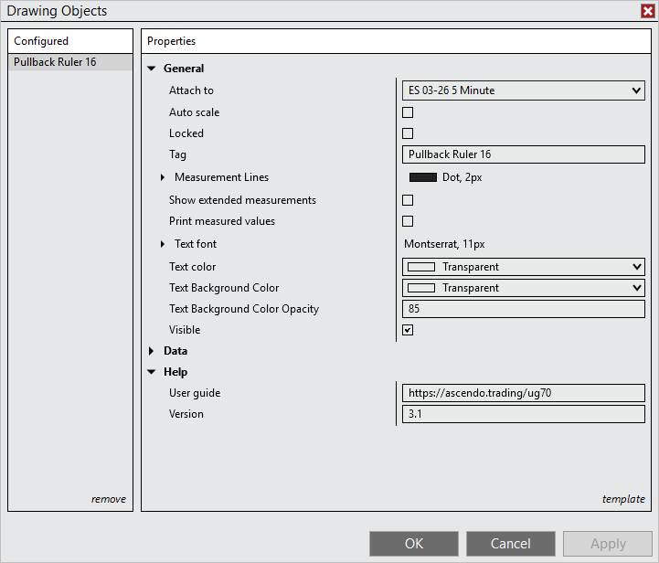 When enabled, the Pullback Ruler is included to the auto-scaling of the chart so the vertical axis of the chart will be adjusted such that the Pullback Ruler drawing will always be visible.